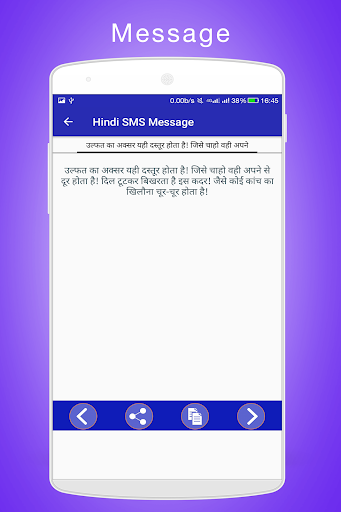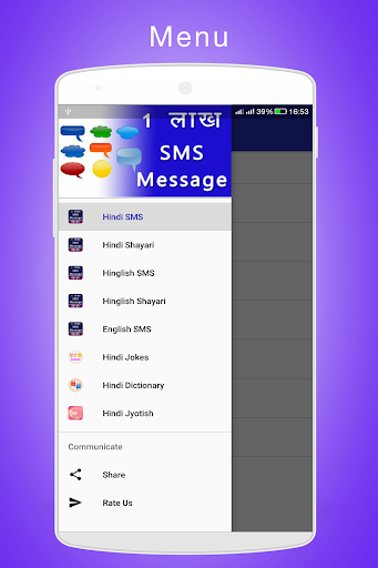 • इस ऐप में संदेश और एसएमएस 5 श्रेणी में विभाजित हैं हिंदी एसएमएस, हिंदी शायरी, हिंगलिश एसएमएस, हिंगलिश शायरी, अंग्रेजी एसएमएस