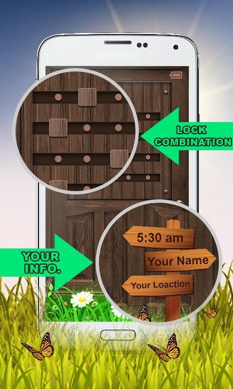 घर के दरवाजे लॉक स्क्रीन घर लॉक स्क्रीन और अधिक प्रकृति और सुरक्षित लॉक करने के लिए पास बनाने के लिए एक प्राकृतिक तितली एनीमेशन स्क्रीन पर अपना नाम लिख रहे हैं और होने की अनूठी विशेषता है।