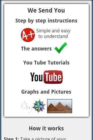 Have you ever got stuck on a question while doing your homework ? Did not have enough time ? Then this is the app for you, take a picture of your question and we will send back step by step instructions, video tutorials and answers. Save time by using the app rather spend it searching endlessly for an answer and have the answers and youtube video tutorials sent right to your phone.