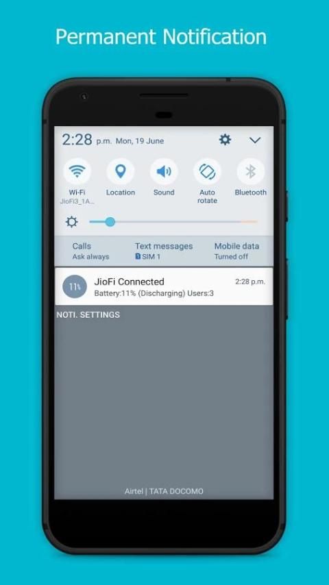 प्रदर्शित करता है विस्तृत जानकारी बैटरी प्रतिशत और JioFi हॉटस्पॉट से जुड़े उपयोगकर्ताओं की सूची भी शामिल है 'Jiofi के लिए हॉटस्पॉट प्रबंधक'। उपयोगकर्ताओं को भी एक बटन के क्लिक के साथ आसानी से पासवर्ड और नेटवर्क SSID नाम बदल सकते हैं। वहाँ भी हॉटस्पॉट से कनेक्ट होने से किसी भी उपयोगकर्ता ब्लॉक करने का विकल्प है। स्थायी नोटिफिकेशन भी स्थिति पट्टी जो बैटरी और जुड़े उपयोगकर्ताओं को इंगित करता है पर दिखाया गया है।