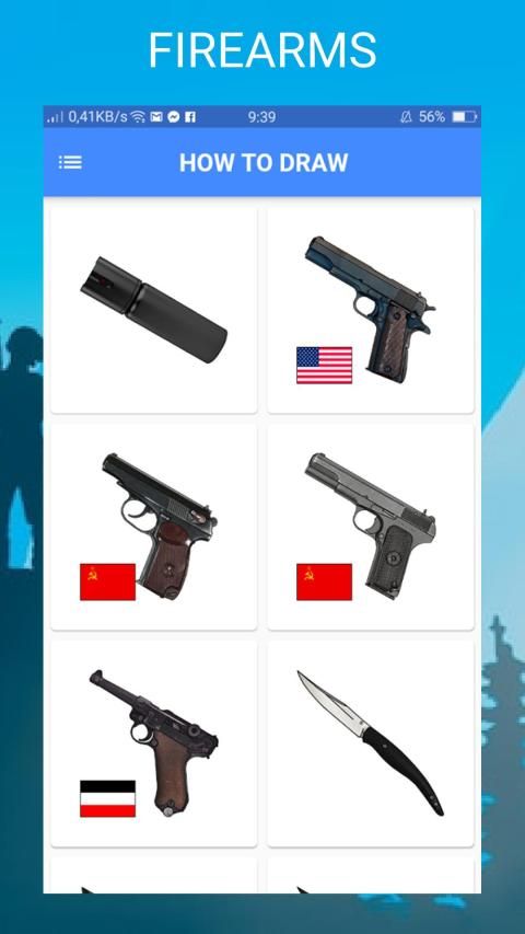 How To Draw Guns app composes of a lot of cute cartoon drawings weapons , like draw draw assault rifles,draw sniper rifles, draw rifles, draw cold weapons, draw knives,draw swords...