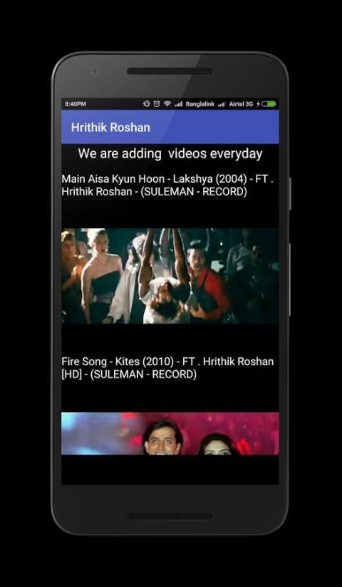 इस ऐप्लिकेशन में आपको रितिक रोशन गाने हिट हो जाएगा। आप अपने पसंदीदा गीत के लिए खोज कर सकते हैं खोज विकल्प का उपयोग करना। मुझे आशा है कि आप इस अनुप्रयोग का उपयोग कर मजा करेंगे।
