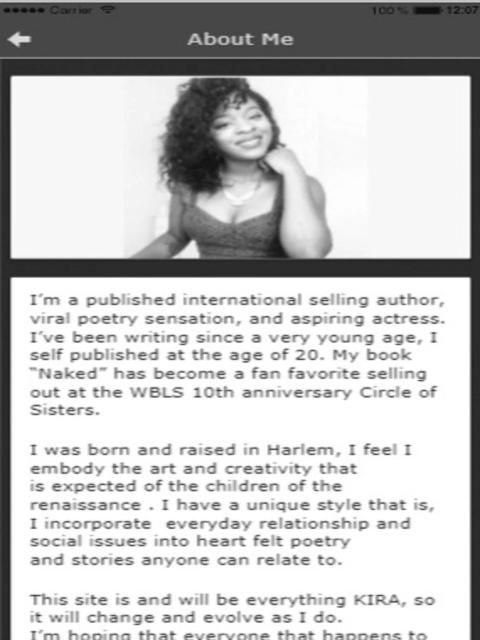 Download the viral poetry sensation and aspiring actress, Kira J app. It features video poetry recitals from Kira J and videos from other viral sensations with deals, product offers and other info on selected topics you can view from with the app.