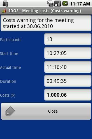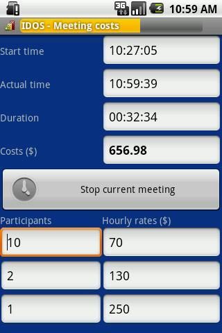 Cost calculation based on the number of participants and their hourly rates. Warning when the configurable cost limit is exceeded. Meetings can be saved and send by email. Configurable voice output on program start/end, meeting start/end and warnings. [ money timer stop watch time clock chronometer stopwatch charge ]