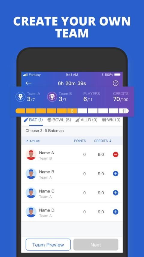 Your objective is clear: select your team from the World's best cricket players, to outscore your opponents and top the leaderboard. Players score points in multiple ways, from batting to bowling, to fielding.
