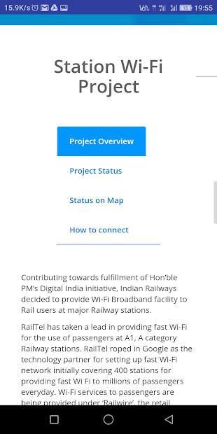 इस ऐप का उपयोग करने वाले उपयोगकर्ता इंडियन रेलवे वाईफाई परियोजना विवरण देख सकते हैं।