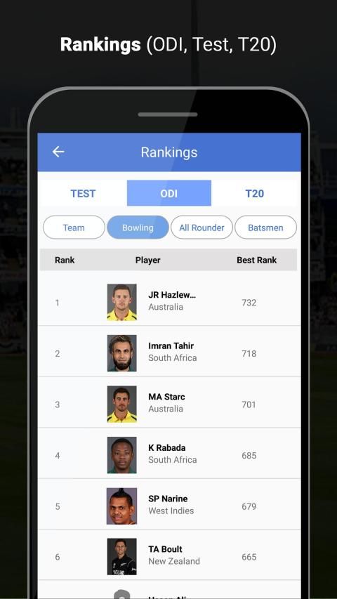 ICC Rankings for team, batsman, bowler, allrounder for test match, ODI and T20.