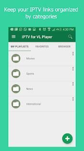 IPTV is a popular protocol to stream TV on Internet. Most famous video players are compatible with IPTV playlists, but the way they manage the channels is very poor. IPTV Manager for VL is a great app to keep all your TV links safe in the same place, group them by your own categories, share them, etc. Create your own playlists with your favorite channels.