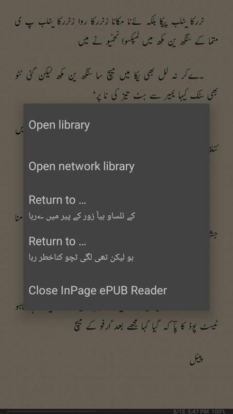 InPage ePub रीडर Mobi (गैर संरक्षित किताबें जलाने सहित) ePub, आरटीएफ, डॉक्टर, और सादा पाठ फ़ाइल स्वरूपों का समर्थन करता है। InPage ePub रीडर उर्दू और राइट-टू-वाम भाषाओं के लिए बनाई गई है।
