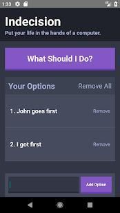 We've made it so easy to use that even a sack of potatoes can work it. You're not as smart as that so all you have to do is add whatever your options are into the input box followed by pressing add option after every option. Then click the 'what should I do' button and be on your merry little way.