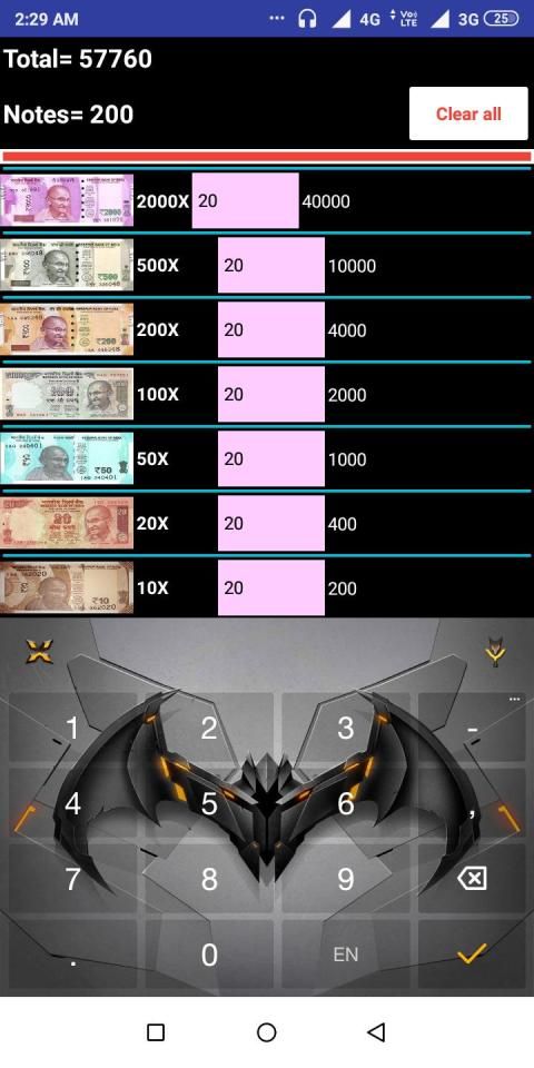 Only For indian currency denominations,Tally My cash Indian Money Counter and Calculator, Save daily database. Total of all Notes in digit. Share countig details to any social media and app. Indian currency denominations Calculator. Get total in words also (indian style) daily cash, speak total amount in hindi and english, daily counter,