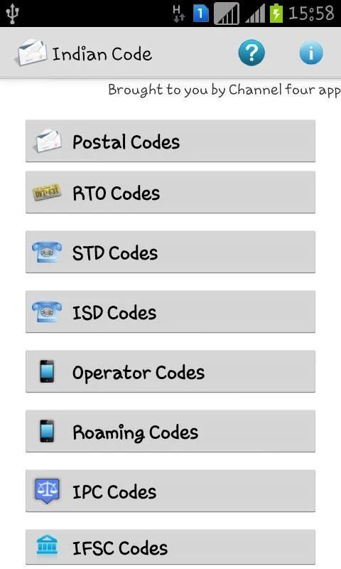 नीचे सूचीबद्ध के रूप में यह आवेदन आप भारत भर में कोड की विभिन्न प्रकार प्रदान करता है. इस आवेदन ऑफ़लाइन काम करने के लिए बनाया गया है और सबसे अच्छी बात यह कोई विज्ञापन नहीं है है.