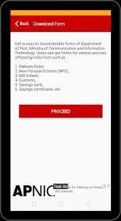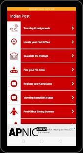भारतीय पोस्ट जो ट्रैकिंग शिकायतें, निविदाएं और भी बहुत कुछ स्पीड पोस्ट स्थिति, ट्रैकिंग खेप, डाक घर खोजें, स्पीड पोस्ट कैलक्यूलेटर, बचत योजनाएं, भर्ती, एजेंटों लॉग इन, पंजीयन शिकायतें, प्रदान करता है एक नागरिक मोबाइल एप्लिकेशन है।