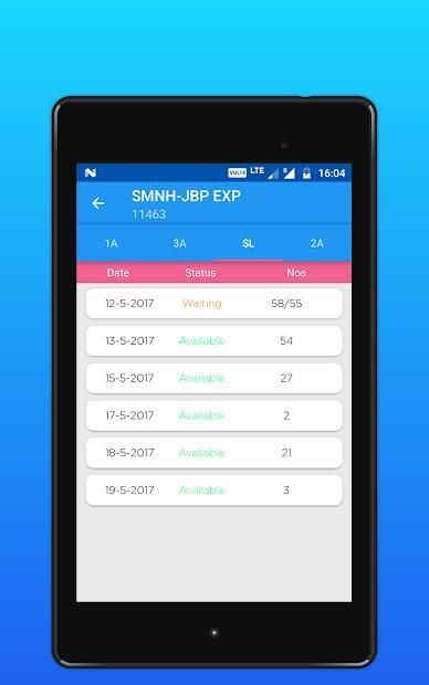 ट्रेनों में 4. सीट उपलब्धता एक ही स्क्रीन में अगले 5 दिनों की उपलब्धता के साथ श्रेणी के आधार पर। अगले दिन उपलब्धता के लिए किसी भी आगे की स्क्रीन को स्थानांतरित करने के लिए कोई ज़रूरत नहीं।