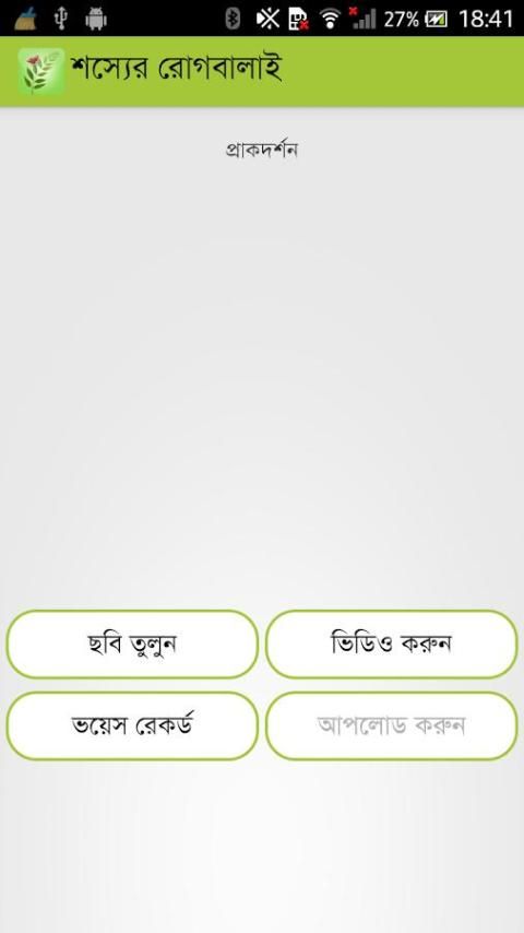 यह विशेष रूप से किसानों के लिए कृषि क्षेत्र के लिए एक बहुत ही उपयोगी और इंटरैक्टिव अनुप्रयोग है. फसलों की बीमारियों और अपनी इसी की रोकथाम और इलाज की प्रक्रिया एक क्लिक दूर उपयोगकर्ताओं (किसानों) से है. सबसे पहले, खोलने के बाद इस छप स्क्रीन उपयोगकर्ता से पहले दिखाया जाएगा क्षुधा. तो देखने के लिए ग्रिड के रूप में सूची निम्नलिखित फसलों के लिए प्रकट हो जाएगा: धान, गेहूं, आलू, जूट, टमाटर और आम. एक विशिष्ट फसल चयन करने के बाद, रोकथाम और इलाज के लिए प्रासंगिक छवियों और जानकारी के साथ शामिल रोग की एक सूची में textually के रूप में अच्छी तरह से ऑडियो और वीडियो प्रारूप के रूप में दिखाया जाएगा. उपयोगकर्ता तो वे पढ़ने या सुनने या दिया फाइलें देख सकता नेत्रहीन मौजूदा डेटाबेस पत्ती के साथ पत्ती तुलना करने के बाद एक विशेष बीमारी का चयन करेंगे. अंत में, वे अपनी फसलों के प्रभावित रोग के लिए रोकने या इलाज के लिए आवश्यक कदम उठाने सकता है.