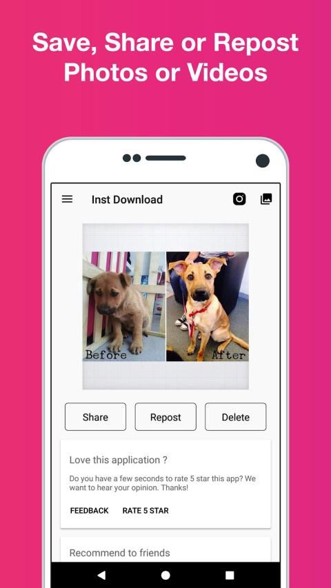 । रेपोस्ट, शेयर और डिलीट फोटो और वीडियो को डाउनलोड ऐप से।