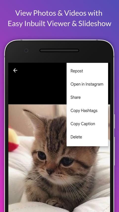 * Easily save videos and photos into device or repost to Instagram