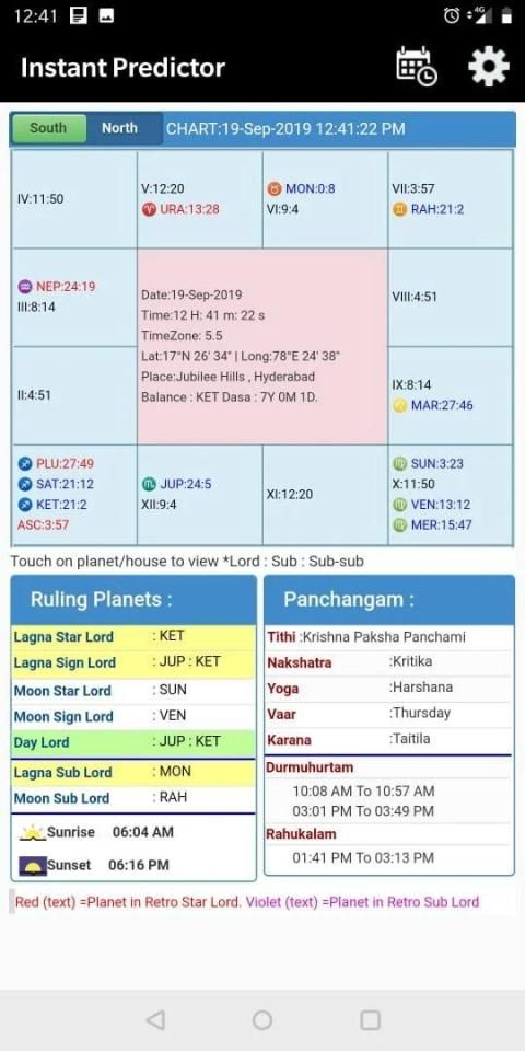 1) Detail KP Time-Chart with Houses and Planets. Both South & North Indian style chart display. On Touching Planet or House you get the Starlord, Sublord and Sub-Sub Lord
