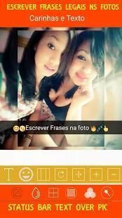Função de filtros e cores colocar aquelas carinhas Emoji de todos os tipos e você expressar com as suas frases e textos sobre a foto.efeitos como barrinha de status sobre a foto e com desfoque tipo borrão nas bordas. escrever texto em fotos com efeitos e botar carinha na foto e colagem e salvar na galeria de fotos.