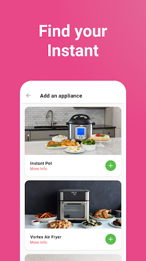 यह ऐप सीधे कनेक्ट होता है एक पूरी तरह से जुड़े खाना पकाने के अनुभव के लिए तत्काल पॉट प्रो प्लस मल्टी-कुकर। "रसोई" स्क्रीन में पाए गए अन्य तत्काल उपकरणों का उपयोग आपके रसोईघर में जो भी होता है उसके आधार पर नुस्खा खोज और फ़िल्टरिंग को अनुकूलित करने के लिए किया जाता है, लेकिन सीधे उपकरण से कनेक्ट नहीं होते हैं।