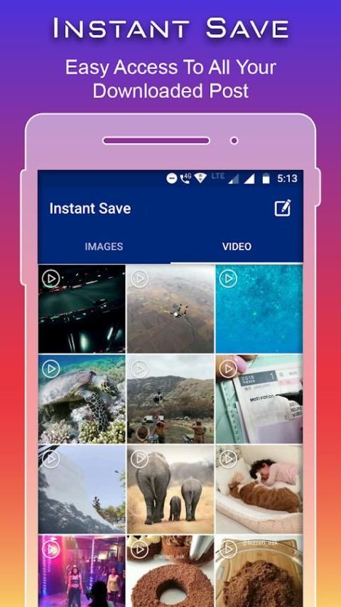 त्वरित इंस्टाग्राम से चित्र और वीडियो डाउनलोड करने के लिए एप्लिकेशन सहेजें।