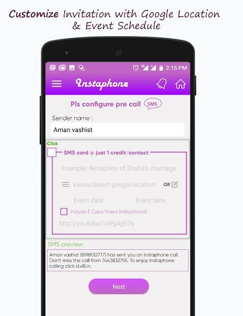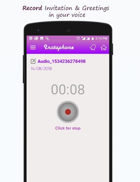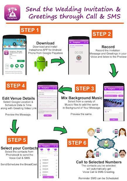 शादी के निमंत्रण, शादी के निमंत्रण, पार्टी आमंत्रण, जन्मदिन के निमंत्रण, महिलाओं के संगीत निमंत्रण, कॉकटेल पार्टी आमंत्रण Instaphone ऐप द्वारा त्वरित और आसान बना दिया जाता है। अब आवाज़ प्रसारण के माध्यम से अपने वॉयस संदेश को प्रसारित करके वास्तविक समय में आमंत्रण भेज सकते हैं यानी वॉयस कॉल और प्राप्तकर्ताओं की संख्या (मोबाइल नंबर) पर एसएमएस। Instaphone एक अभिनव निमंत्रण ऐप है जो एक आम आदमी को चार आसान चरणों का पालन करने वाले अपने दोस्तों को वॉयस कॉल और एसएमएस प्रसारित करने की शक्ति प्रदान करता है: