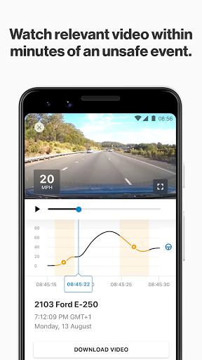 एकीकृत वीडियो ऐप आपको देखने के लिए एक अलर्ट प्राप्त करने की अनुमति देता है जब कोई वीडियो देखने के लिए उपलब्ध होता है, कठोर ड्राइविंग घटनाओं के वीडियो फुटेज को देखें और कठोर के बारे में उपयोगकर्ता रेटिंग प्रदान करें ड्राइविंग वर्गीकरण। जब आप घर पर हों, कार्यालय में या क्षेत्र में हों, तो अपने ड्राइवरों के साथ क्या हो रहा है इसके बारे में जानें।