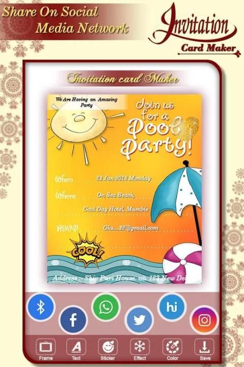 ► उपयोगकर्ता WhatsApp, जीमेल, स्काइप, आदि जैसे विभिन्न एप्लिकेशन के माध्यम से प्रियजनों को निमंत्रण कार्ड बनाया भेज सकते हैं