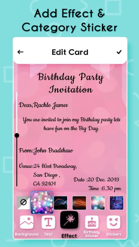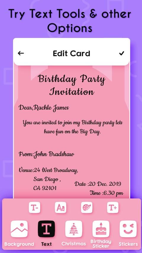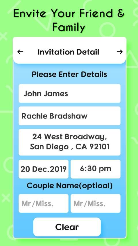 सुंदर और पेशेवर टेम्पलेट्स का उपयोग करके सेकंड के भीतर पार्टी, जन्मदिन, शादी समारोह, सगाई / अंगूठी समारोह के लिए अपना खुद का निमंत्रण कार्ड बनाएं।