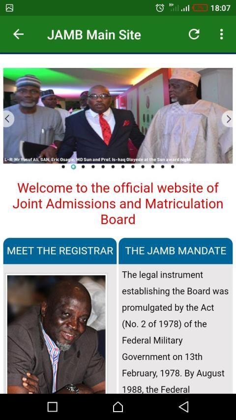 This is a Mobile Application for students who are ready to write JAMB in order to secure admission into the Nigerian Tertiary Institutions. The application will enable users access the official websites of JAMB which are made in just one app. Students will find it easy to have and be informed about updated news from JAMB and lots more.