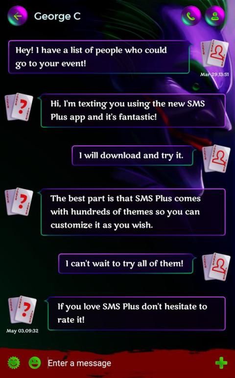 अपने उबाऊ SMS एप्लिकेशन से बाहर निकलें और नए जोकर विषय आजमाइए। आप कितना अच्छा आपकी संपर्क सूची दिखेगा और कैसे शांत अपने मित्रों को संदेश भेज हो जाएगा की चकित हो जाएगा।