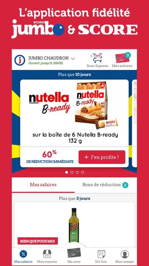 Avec la nouvelle appli Jumbo Score Max, fini les bons de réduction papier qui dépassent dans votre portefeuille. Fini les tickets de caisse perdus ! Faites le ménage dans votre portefeuille et profitez de tous vos avantages fidélité à portée de main !