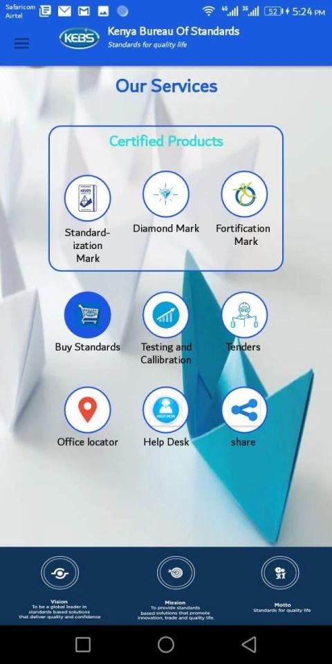 Using the app you can now be able to perform all inquiries regarding the verification of various Products permit validity status.i.e .Standardization mark,Diamond mark and Fortification Mark.