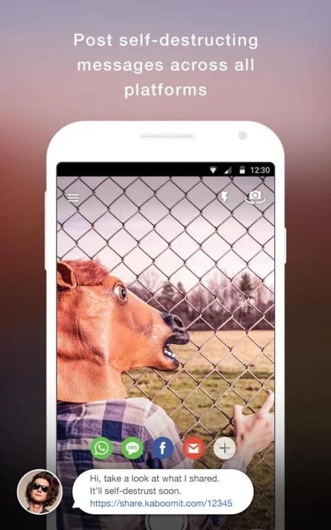 आप Kaboom पर एक खाता बनाने की जरूरत नहीं है, लेकिन Kaboom की अनुमति देता है बल्कि आप एसएमएस, ई-मेल, WhatsApp या हैंगआउट सहित किसी भी सेवा पर एक संदेश भेजने के लिए - ख़ुदकुशी सुविधाओं का आनंद लेने के लिए प्रत्येक विभिन्न सेवाओं के लिए स्विचन के बिना। बस के बाद स्वचालित रूप से एक का पता लगाने के बिना हटाया या समाप्त हो जाएगा, जिसके बाद एक समय निर्दिष्ट करें।