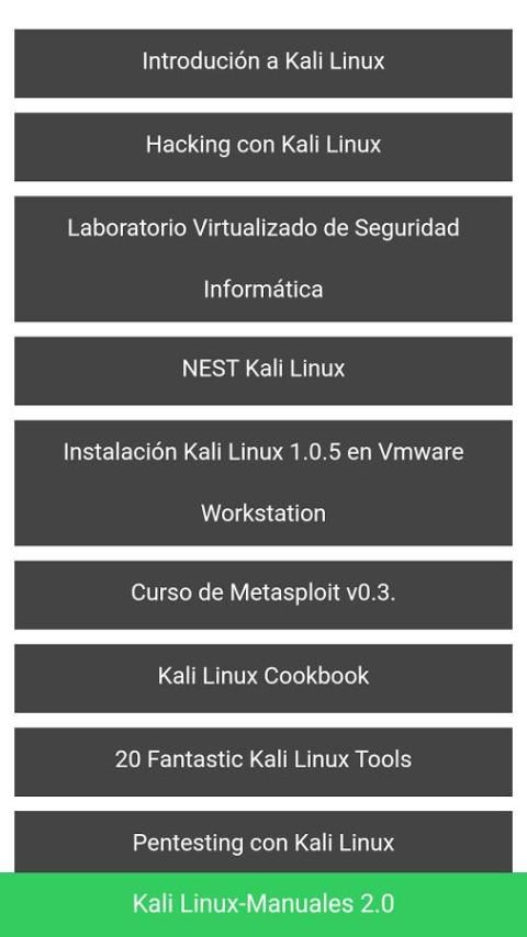 एंड्रॉयड उपकरणों के लिए ऐप काली लिनक्स नियमावली एक साधारण आवेदन है और एक ही समय में उपयोगी है क्योंकि यह वायरलेस नेटवर्क और सुरक्षा प्रणालियों बल्कि दिलचस्प पर ज्ञान की एक संस्था को प्राप्त करने के लिए अनुमति देता है।