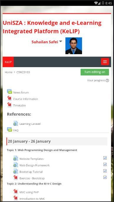 Knowledge and eLearning Integrated Platform for Universiti Sultan Zainal Abidin. It offers online course's materials, activities and assessment for learning purposes.
