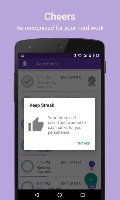 अब अपने लकीर, बेहतर अपने इनाम। स्ट्रीक रखें रिबन जो अपने धारियाँ के अनुरूप के साथ अपनी उपलब्धियों को पहचानता है। आप इतने लंबे समय के रूप में आप अपने लकीर रखने रिबन रख सकते हैं। कुछ दिनों के बाद सफल एप्लिकेशन भी आप को दिखाने के लिए कि कैसे पास तुम अगले उपलब्धि के लिए कर रहे हैं एक प्रगति बार दे देंगे।