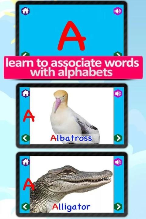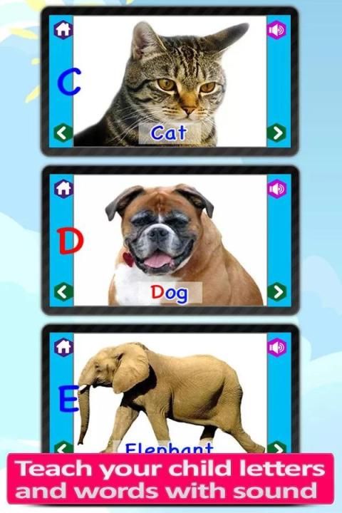 प्रत्येक पत्र इस के साथ, अपने वास्तविक चित्र और ध्वनि के साथ एक पशु से संबंधित होगा वहाँ होगा पत्र और जानवर के नाम का उल्लेख एक मानव आवाज। यह आपके बच्चे अक्षर, जानवरों और उनकी आवाज़ के साथ परिचित बनने के लिए मदद मिलेगी।