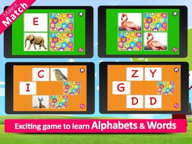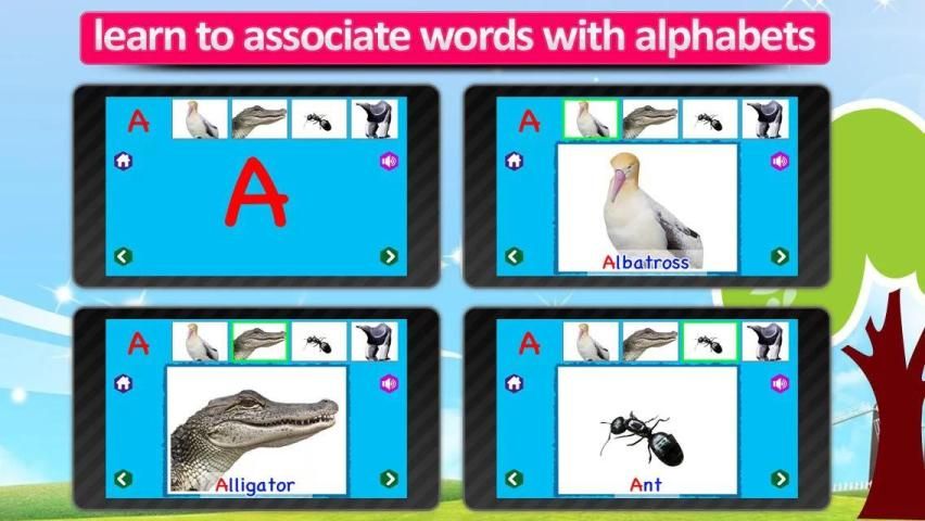 Here Animals are sequenced in such a way that their names are in the same flow as the alphabets, that is, A to Z. Animal ABC shows the name of the animal with the first character highlighted. You can even switch off display of animal name, reciting the name and the real animal sound.