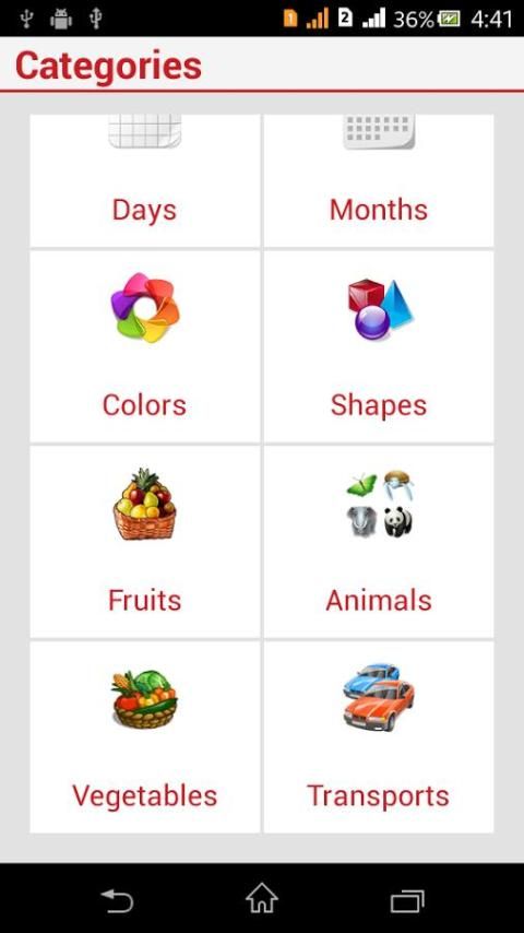 ** अक्षर, संख्या, दिन, महीने, रंग, आकार, फल, पशु, सब्जियां और transports