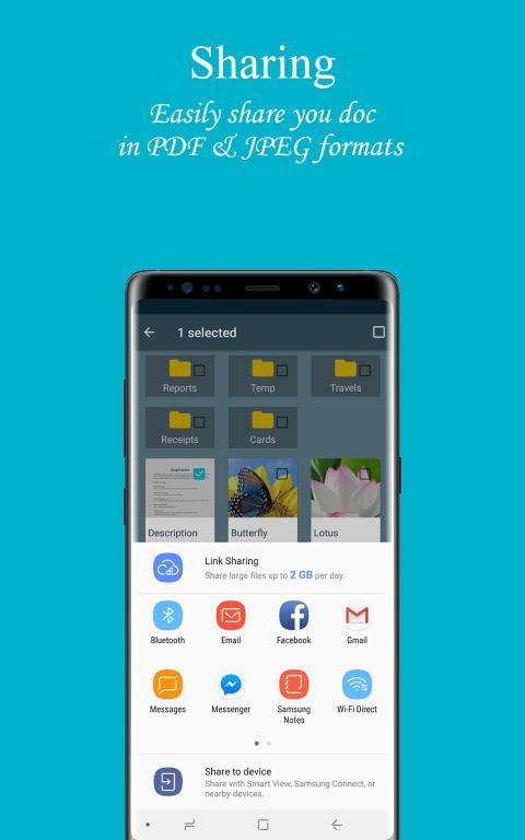 Easy share doc in PDF, JPEG formats via social, email,...