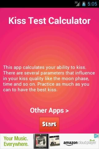 चुंबन टेस्ट कैलक्यूलेटर चुम्बन करने के लिए अपनी क्षमता का परीक्षण है कि एक स्वतंत्र अनुप्रयोग है। यह सच में मज़ा और प्रयोग करने में आसान है। अब आप एक फिल्म स्टार की तरह चूम अगर आप पता लगा सकते हैं या आप एक मेंढक की तरह चुंबन। यह सिर्फ जानना आसान है: