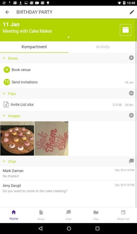 अपने जीवन के हर पहलू के लिए आभासी की डायरी का एक प्रकार है और फाइलिंग कैबिनेट के रूप में एक kompartment के बारे में सोचो। सामाजिक घटनाओं, व्यक्तिगत बिल और वित्त, छुट्टियों, बच्चों, विस्तारित परिवार, मरम्मत, या कुछ और अपने जीवन में चल रहा है के लिए kompartments प्रयोग करें, और जानकारी साझा करते हैं, वास्तविक समय में, अन्य लोग हैं, जो यह पता करने की जरूरत है।