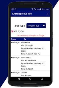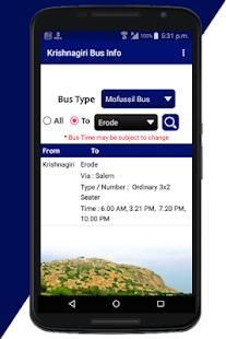 This app provide all information about Krishnagiri Mofussil bus and Town bus.