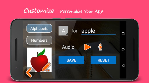 Parents can fully personalize it for your child. here you can customize each letter's SPELLING, letter's PICTURE and RECORD YOUR VOICE for description.
