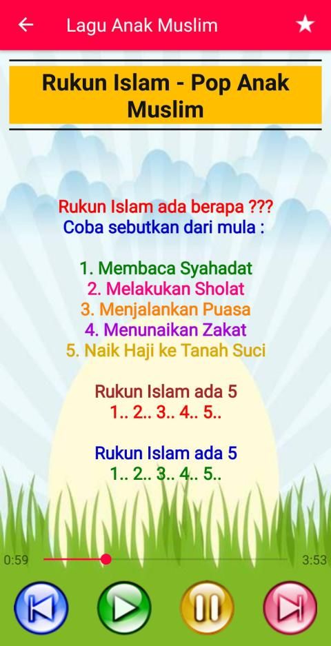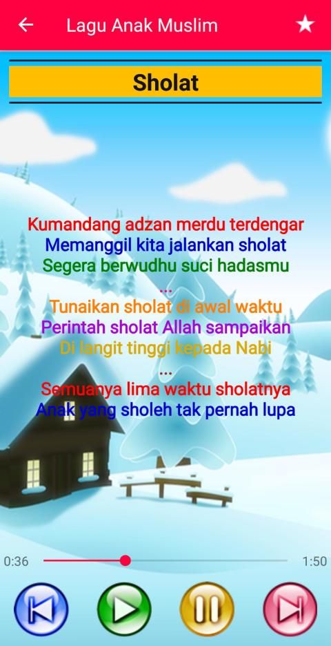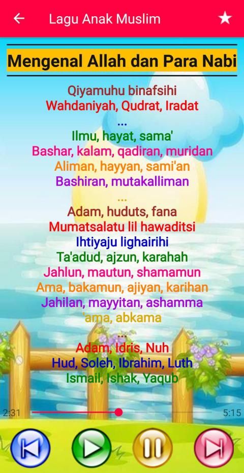 यह मुस्लिम चिल्ड्रन सॉन्ग के लिए सबसे आकर्षक एप्लीकेशन है, जिसे सबसे अच्छे डिजाइन के साथ बनाया गया है जो अद्वितीय और रंगीन है, इसलिए यह बच्चों के लिए आकर्षक है। तेजी से और हल्के आवेदन, और बहुत सरल और प्रयोग करने में आसान। पृष्ठभूमि / वॉलपेपर प्रत्येक गीत के लिए अलग है इसलिए इसे बच्चों द्वारा पसंद किया जाता है।
