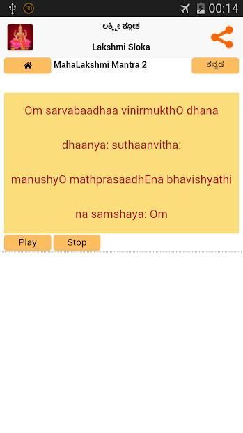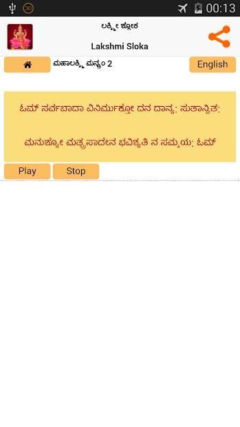 यह आवेदन लक्ष्मी के प्रति भक्ति में है। यह नीचे श्लोक और ऑडियो के साथ कन्नड़ और अंग्रेजी में मंत्र है। ऑडियो मंत्र उच्चारण सीखने के लिए मदद करता है।