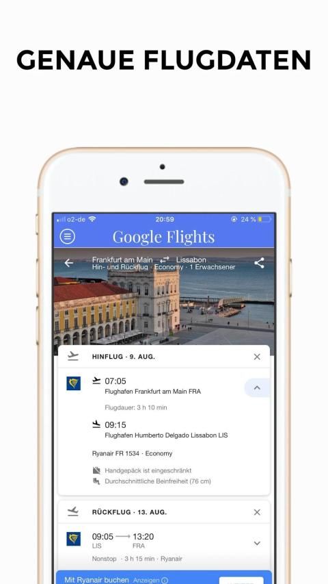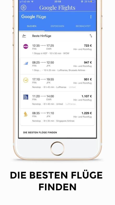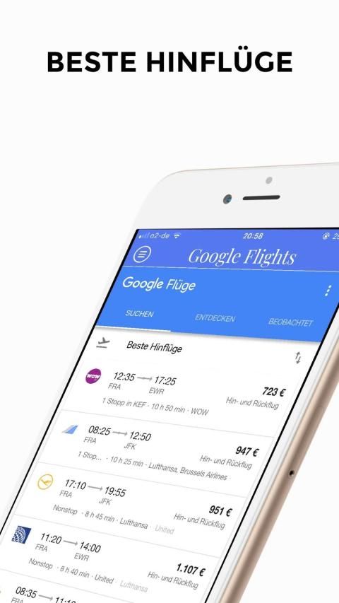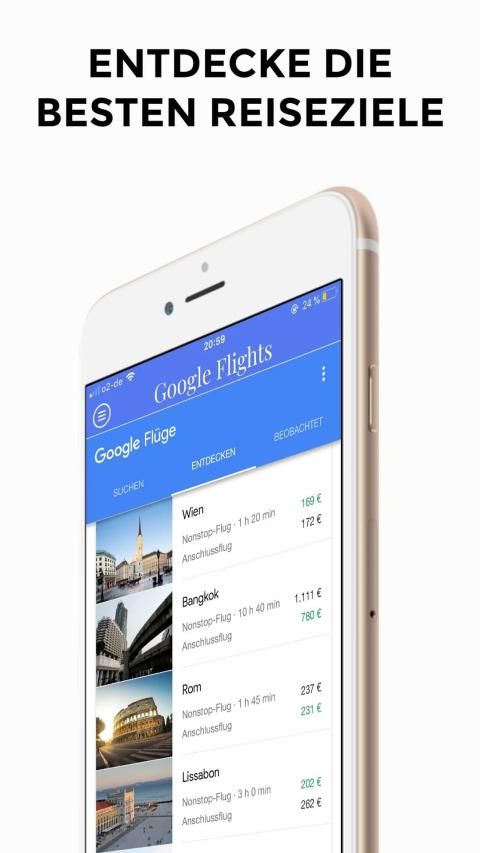 Bei Google Flights findest Du schnell günstige Flüge und Hotels. Du kannst Reiseziele auf einer Karte anzeigen und Benachrichtigungen zu Google Flights und Preisaktualisierungen abonnieren.