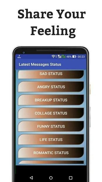 अपने फोन के लिए कई श्रेणियां स्थिति, संदेश और उद्धरण, आप इसे सामाजिक नेटवर्क आदि पर अपलोड करके मित्रों के साथ साझा कर सकते हैं