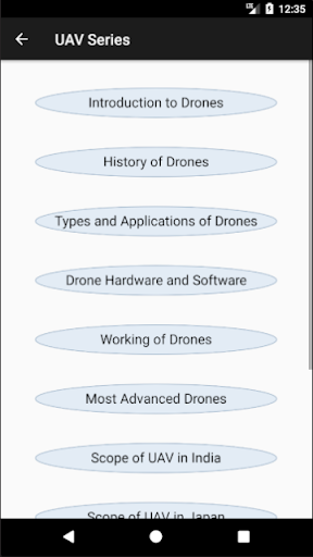 This app has been developed with the prime purpose of providing the basic content in the field of Drones and UAVs from the very beginning so as to make the students or the learner familiar with this field of Remote Control Aviation. Drones or UAVs as we see today have been evolved so much with time starting from just an air balloon. The added complexity in the design and programming of the UAVs provided a great amount of simplicity in terms of the user's reliability and flight stability.